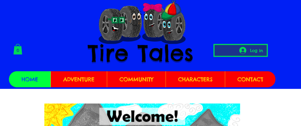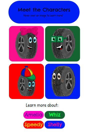 On the Characters page, you can find quick information about each main character of the Tire Tales series! You can also navigate to their own personal page to learn even more via sub-tabs or links on the Characters main page!