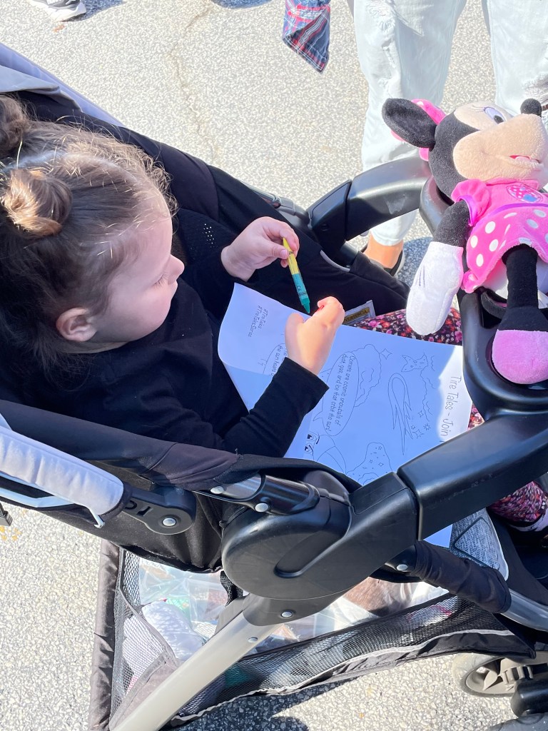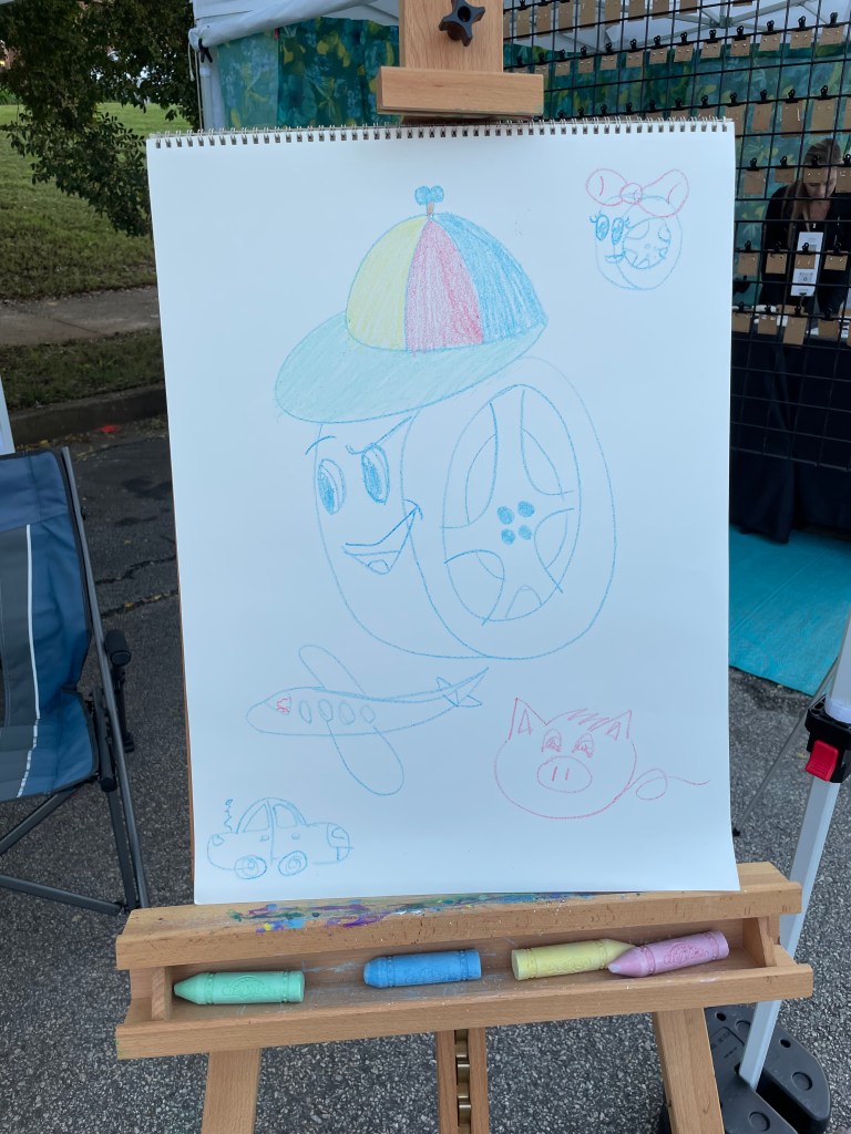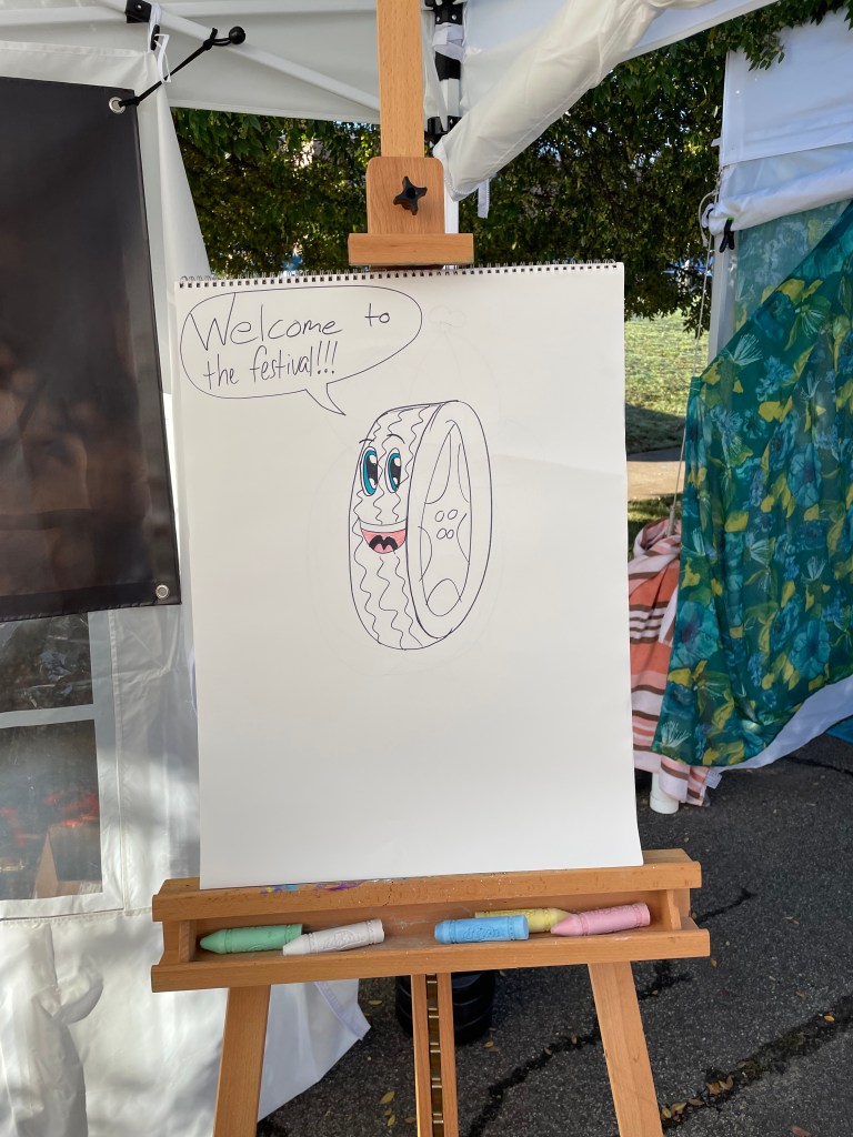 At first I had my easel up near the front so people could watch me draw the Tire Tales characters. I even had some kids that wanted me to draw extra images or wanted to try coloring in the images themselves! (Side note: It is a lot easier to draw on my iPad where I can redo lines than it is with chalk on a drawing pad!!)