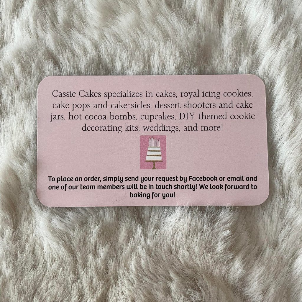 “Baking the world a sweeter place” is the official motto of Cassie Cakes! Cassie Cakes specializes in cakes, royal icing cookies, cake pops and cake-sicles, dessert shooters and cake jars, hot cocoa bombs, cupcakes, DIY themed cookie decorating kits, weddings, and more!
