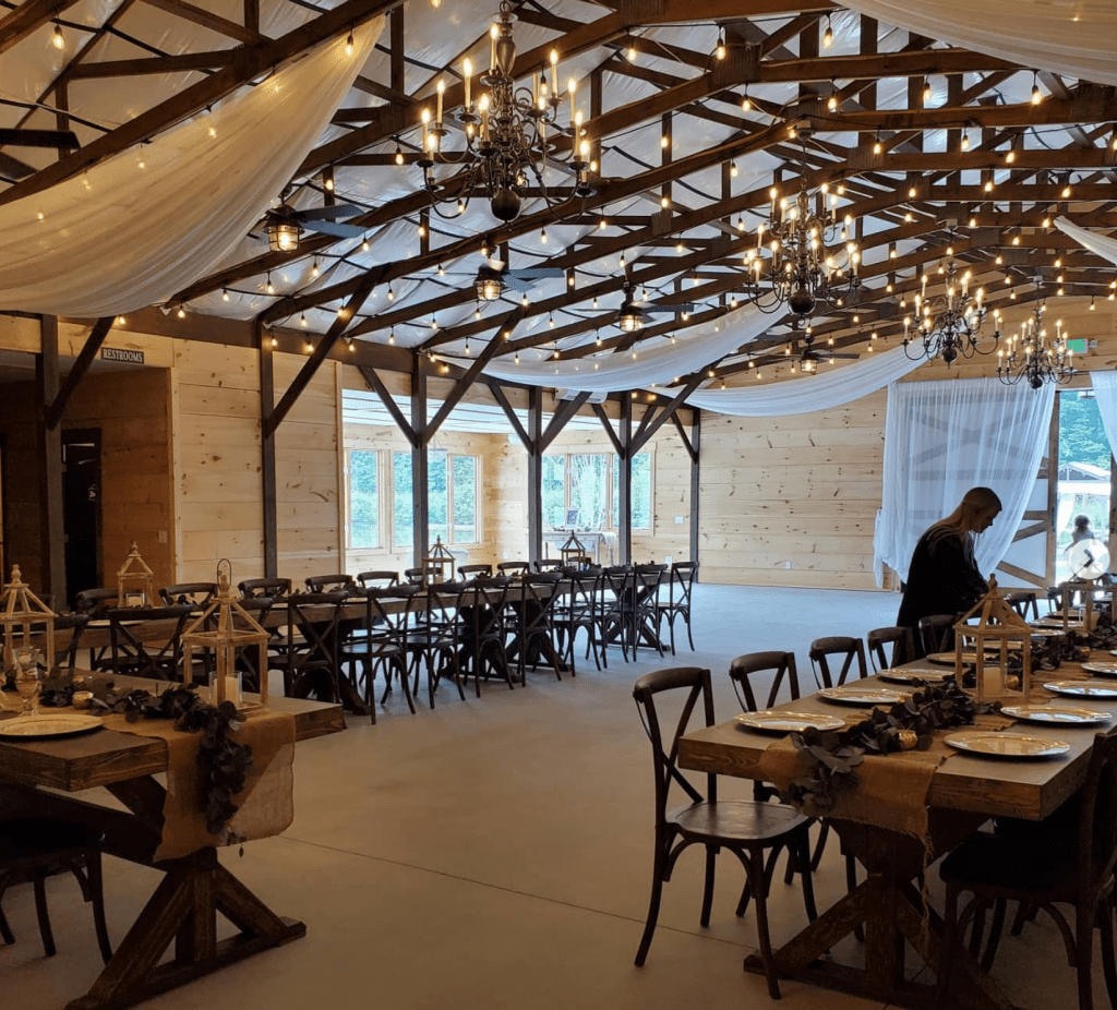 Inside the barn you are greeted by tall ceilings with white draping swaths of fabric coming from the rafters. Those beautiful touches along with a candle planter above where you first walk in and the other side of the barn and rustic chandeliers make for a simply gorgeous setting!